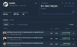 El trader, que antes operaba bajo el nombre AlphaRacoon y luego cambió su usuario a 0xafEe, centra sus apuestas mayoritariamente en tendencias de búsqueda en Google, como «la persona más buscada en 2025» o lanzamientos de productos, aunque también ha incursionado en deportes.