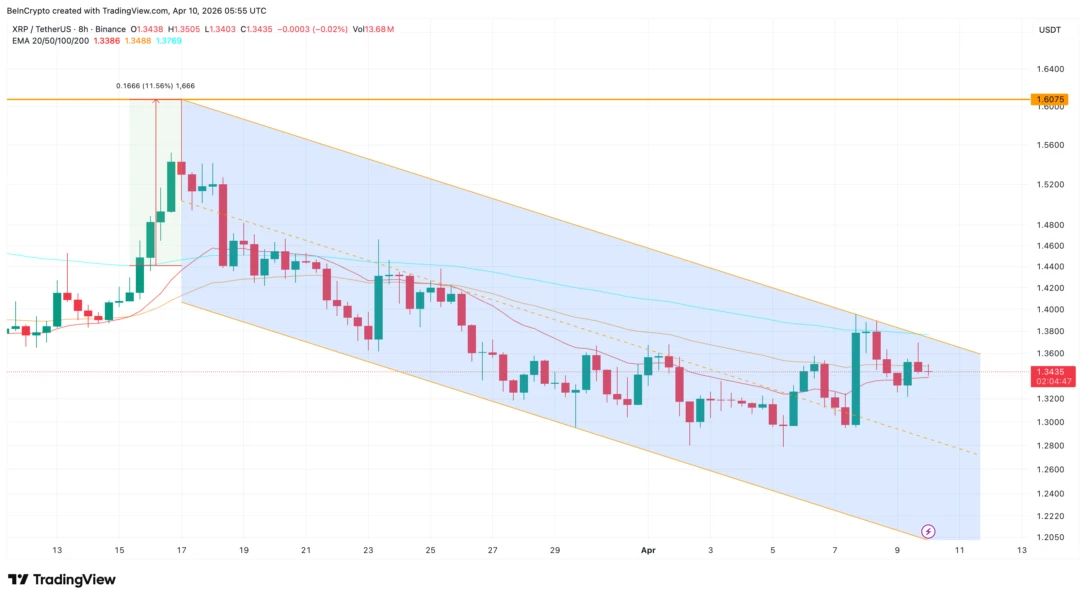El precio de XRP ha estado negociándose dentro de un canal descendente en el gráfico de 8 horas desde su pico del 17 de marzo cerca de 1.60 dólares. Cada intento de salir desde entonces ha fallado en el mismo techo.