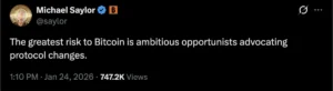 Los «oportunistas» que impulsan los cambios en el protocolo son la mayor amenaza para BTC, según Saylor