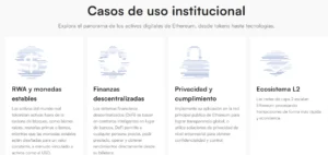 El nuevo sitio destaca la participación de empresas como BlackRock, Visa, eToro y Coinbase, que desarrollan productos financieros tokenizados o servicios de pago basados en Ethereum.