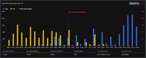 En concreto, expiran más de 24.635 contratos de opciones de bitcoin con un valor nocional superior a 1.700 millones de dólares, junto a alrededor de 379.000 opciones de ether valoradas en unos 380 millones de dólares, sumando más de 2.100 millones en total, como se aprecia en el gráfico.