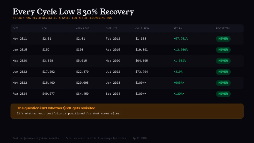 El patrón identificado por Isaiah Douglas sostiene que cada vez que Bitcoin recupera un 30% desde un mínimo de ciclo, nunca regresa a visitar ese fondo. Según Douglas, la regla se ha confirmado 6 veces en más de 13 años de historia.