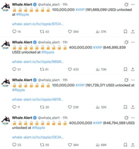 Según datos on-chain, los desbloqueos se dividieron en cuatro transferencias de 100 millones, 400 millones, 100 millones y 400 millones de XRP, con un valor combinado de aproximadamente 1,6 mil millones de dólares al momento de la ejecución.