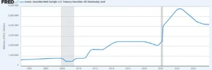 La caída ha sido visible en los títulos del Tesoro. Estos bajaron USD 4.000 millones en noviembre, hasta USD 4,19 billones (como se aprecia en el siguiente gráfico). También en los títulos hipotecarios (MBS), que descendieron USD 16.000 millones, ubicándose en USD 2,05 billones. Igualmente, su nivel más bajo desde 2020.