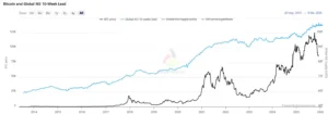 Hay que tomar en cuenta que el comportamiento del mercado de bitcoin ha mostrado correlación con los ciclos de liquidez global. Especialmente desde la expansión monetaria del 2020, cuando la pandemia de COVID-19. Aunque desde hace dos meses se ha abierto una brecha, tal como se aprecia a continuación: